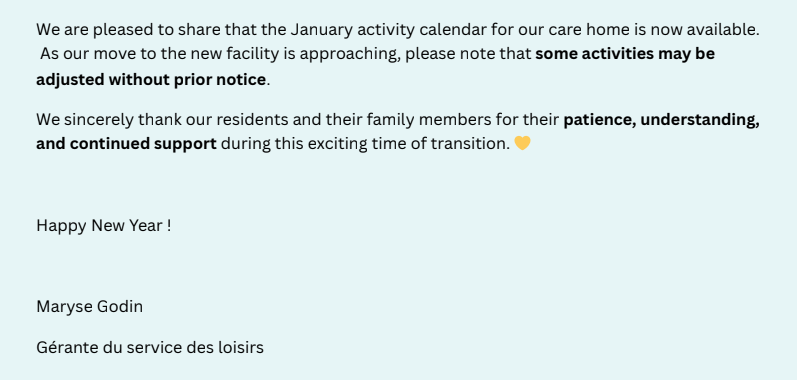 Maison Providence Inc. Maison Providence Inc. is a nursing home for people requiring long-term care. The home is non-profit and governed by a Board of Directors. Maison Providence Inc. was founded in 1970 and now has 174 residents. Since its opening, Maison Providence Inc. continues to meet the needs of its residents and the community. FAMILY INFO LIVING IN OUR HOME Activity program Activity photos