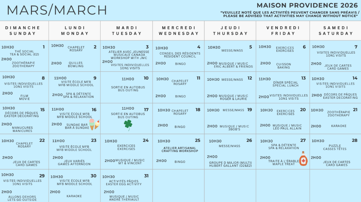 Maison Providence Inc. Maison Providence Inc. is a nursing home for people requiring long-term care. The home is non-profit and governed by a Board of Directors. Maison Providence Inc. was founded in January 2026 and now has 190 residents. Since its opening, Maison Providence Inc. continues to meet the needs of its residents and the community. FAMILY INFO LIVING IN OUR HOME Activity program Activity photos